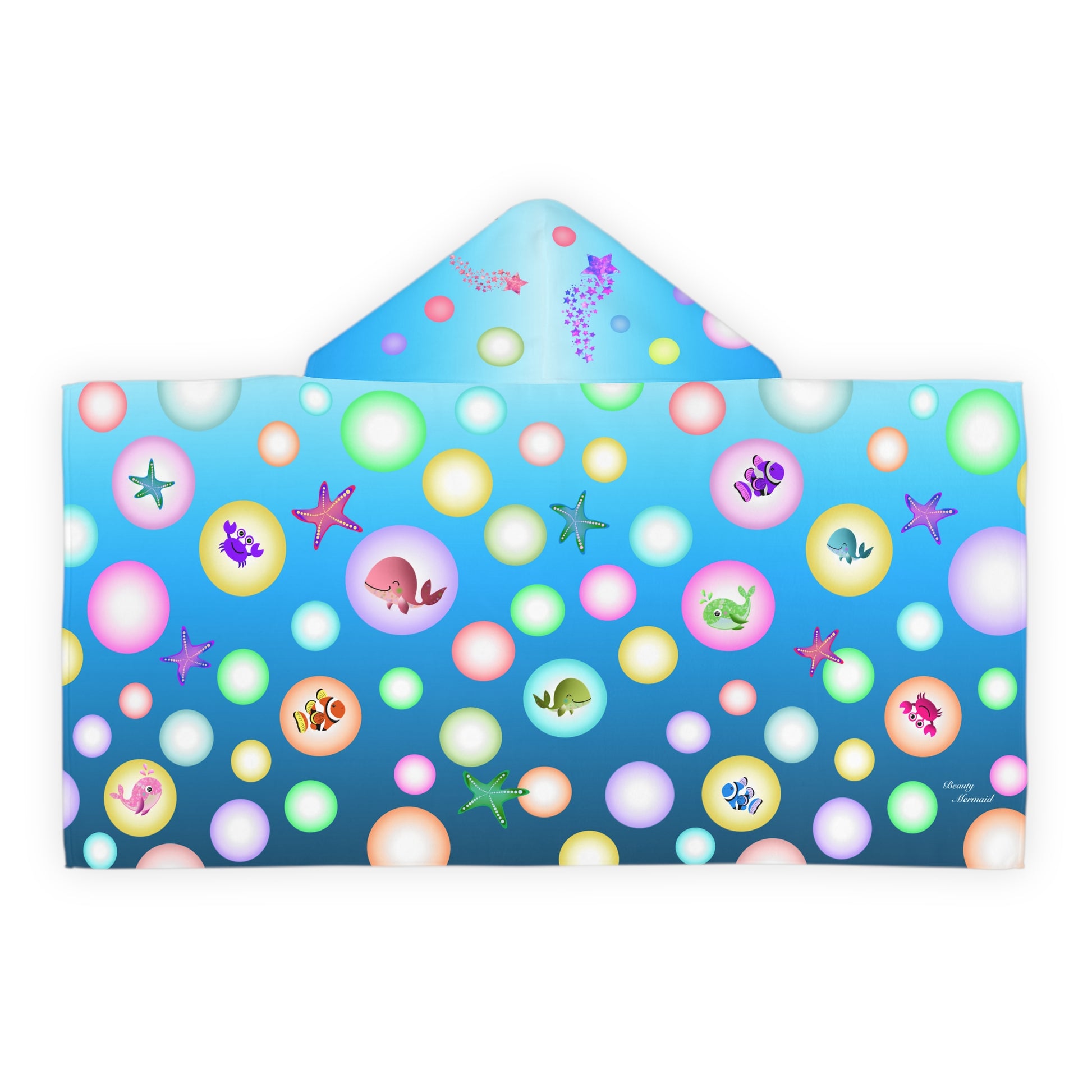 Wrap your little one in the whimsical charm of our Light Blue Bubbles Sea Animals Youth Hooded Towel! This towel features adorable ocean-inspired designs like whales, clownfish, and starfish, making bath and beach time extra fun. Show off your family's love for the sea with this cute and practical towel. Great for vacations, weekends, and holidays by the coast.