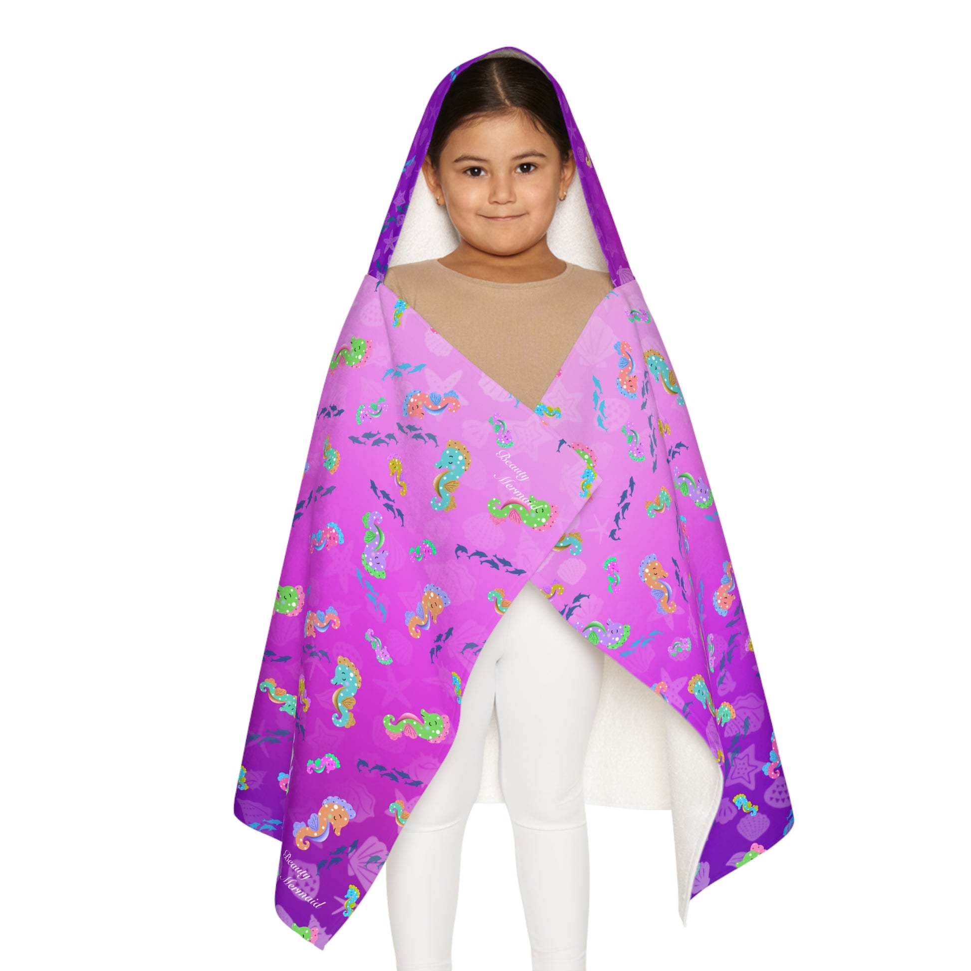 This Youth Hooded Towel features a vibrant purple seahorse design, perfect for beach outings and summer holidays. Made with a soft cotton terry lining, this towel is absorbent and dries quickly, providing the perfect combination of comfort and functionality. Ideal for young kids and teenagers, this towel makes a great gift for family and friends to relax and enjoy the calm atmosphere by the ocean.